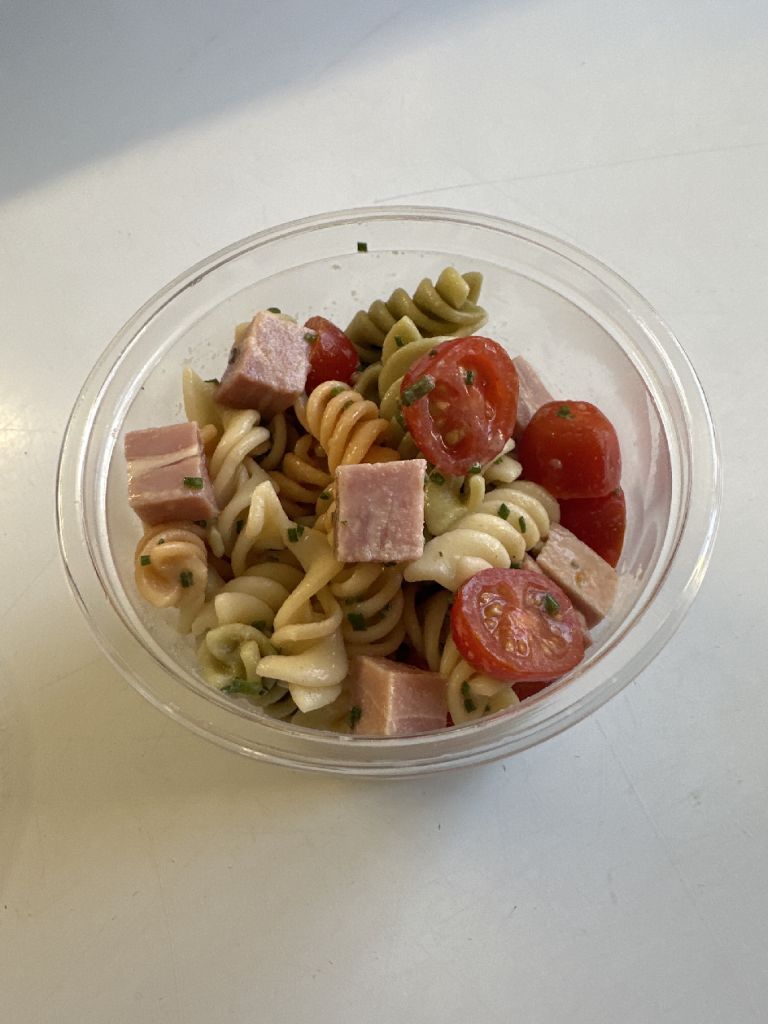 2 pers: salade de pâte,dès de jambon à l’os et tomates cerises