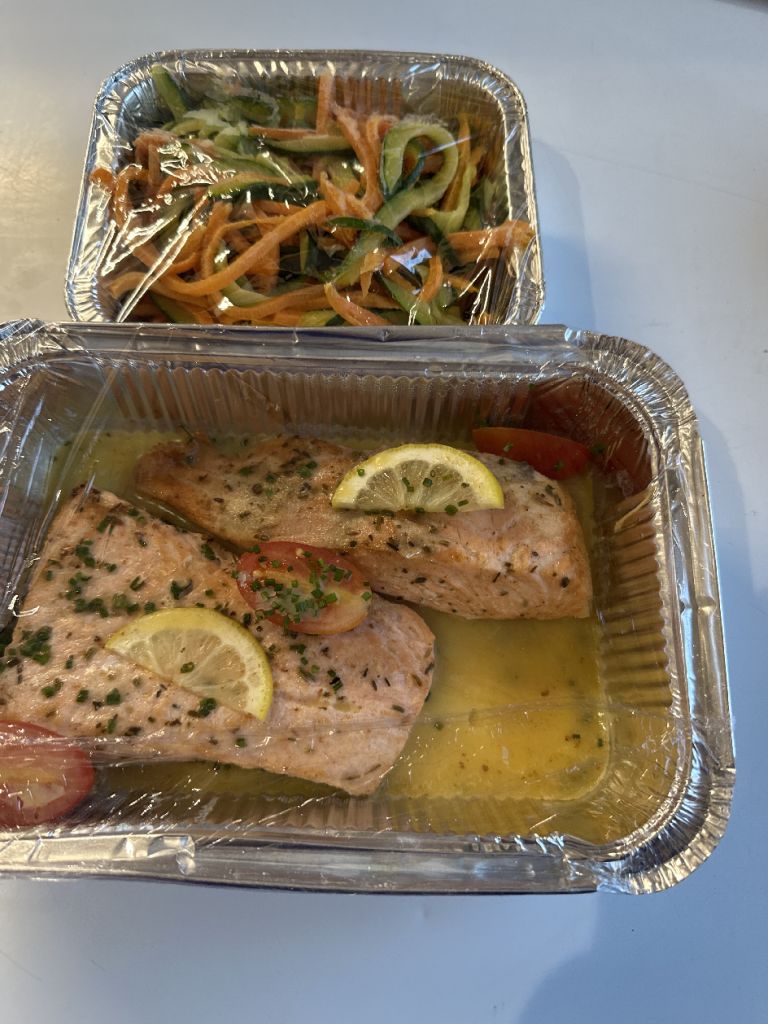 2 dos de saumon meunière de citron, spaghettis de légumes