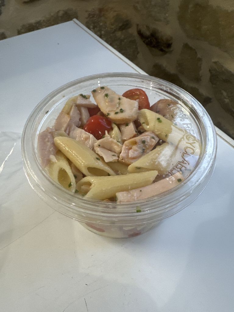 2 pers: salade de pâtes au poulet fumé, dès de tomates et ciboulette