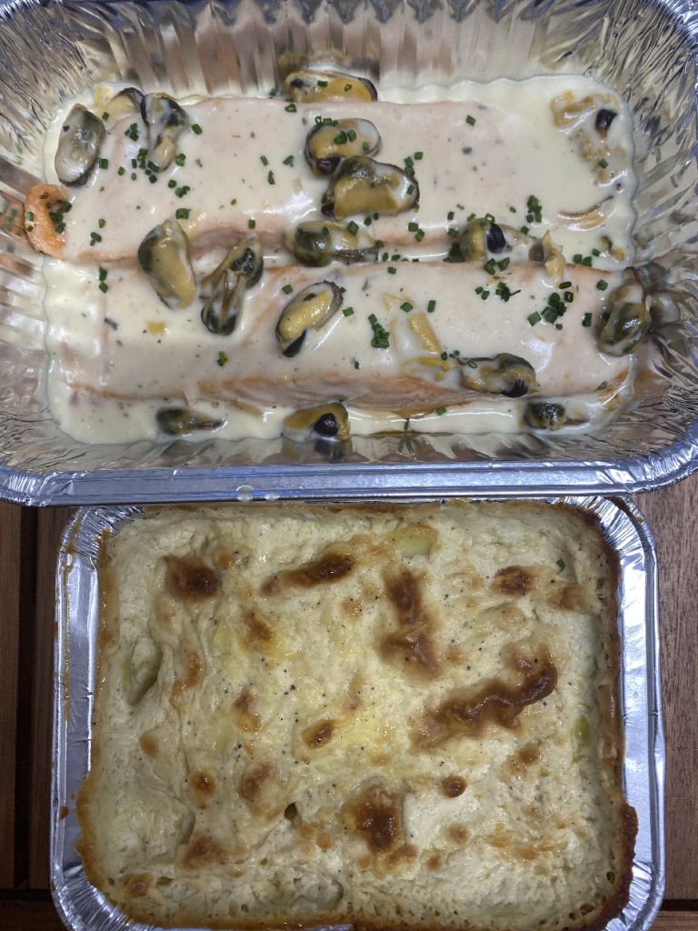2 pers: saumon marinière de moules, gratin dauphinois