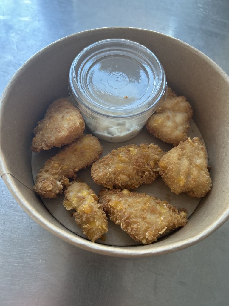 fricassée de volaille, accompagné de sont riz aux oignons poêlée caramélisées, sauce cacahouète aux épices oignons, frits, Cébette, coriandre pickles d’oignons rouges